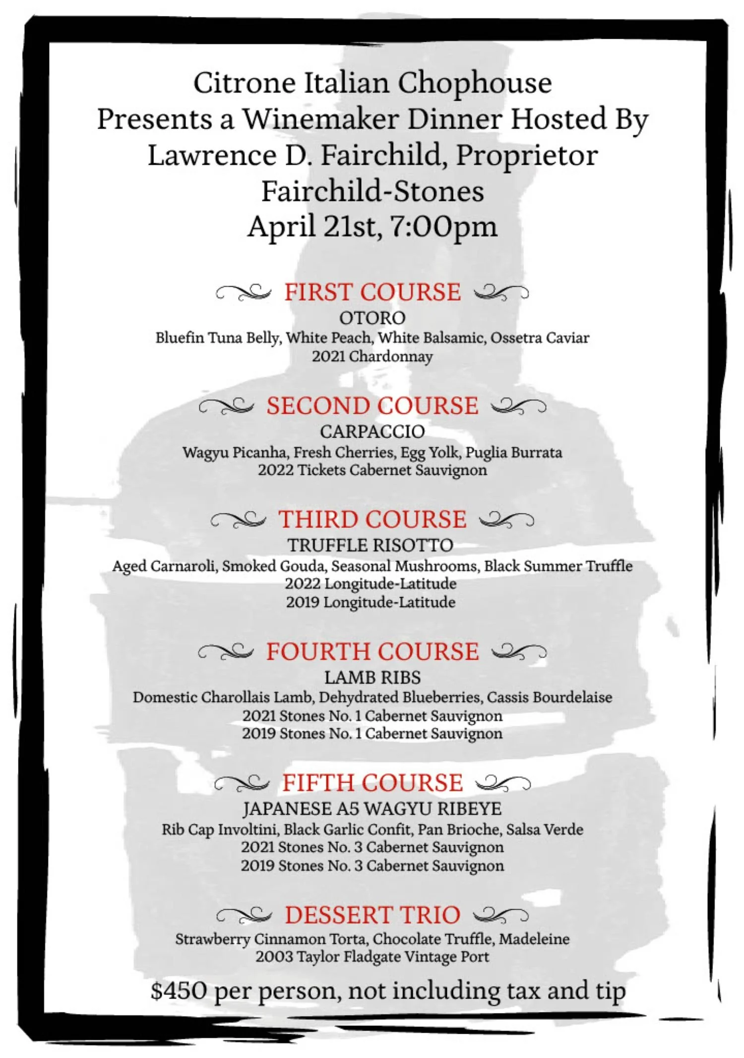Back to All Events Fairchild-Stones Winemaker Dinner Tuesday, April 21, 2026 7:00 PM 9:30 PM Google Calendar ICS